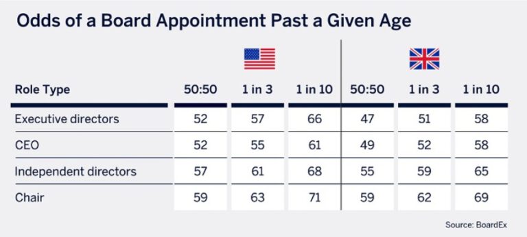 In the U.S., board chair candidates over the age of 71 have a 1 in 10 chance of being appointed, whereas candidates over the age of 59 have a 50:50 chance of being appointed. In the UK, the chances of being appointed to a chair position drop to 1 in 10 at the age of 69.
