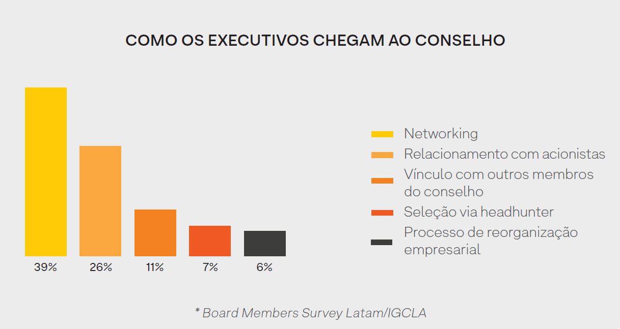O relacionamento com acionistas, conselheiros e executivos C-level é a principal porta de entrada para o conselho das empresas na América Latina. Precisamente 65% das cadeiras dos boards foram escolhidas a partir de networking, como mostra pesquisa do Instituto de Governança Corporativa da América Latina (IGCLA).